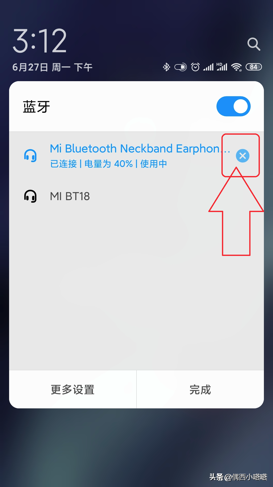 (2). 点击后会打开当前蓝牙设备列表,在列表中找到你的蓝牙耳机,点击它后面的小叉子,如下图所示: