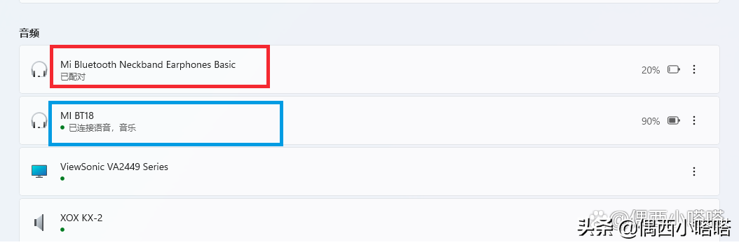 6、断开设备后,该蓝牙耳机还在耳机列表中,会显示已配对,可以参考下图红色圈中的设备截图。蓝色框选择中的设备是当前没有断开的蓝牙音频设备。