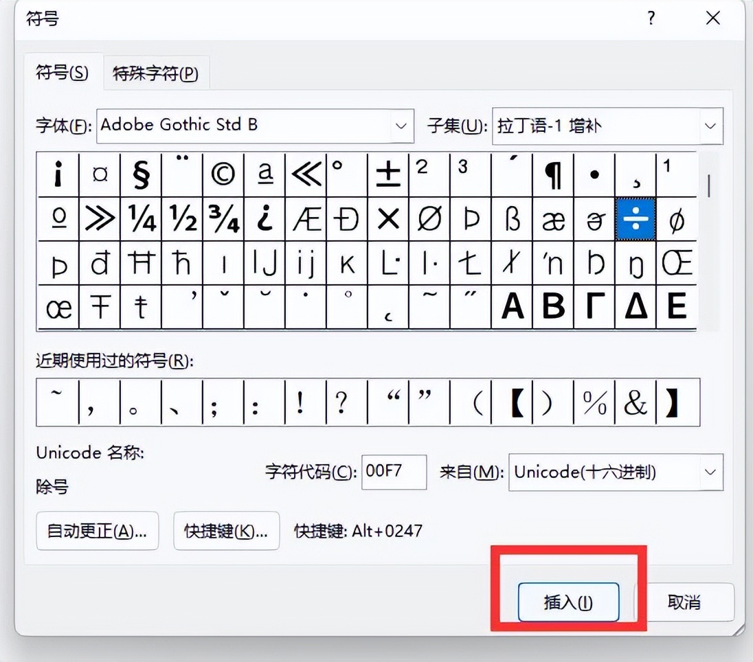 点击数学“÷”后,再点击下方“插入”按钮。“÷”会被插入到你的word文档页面。