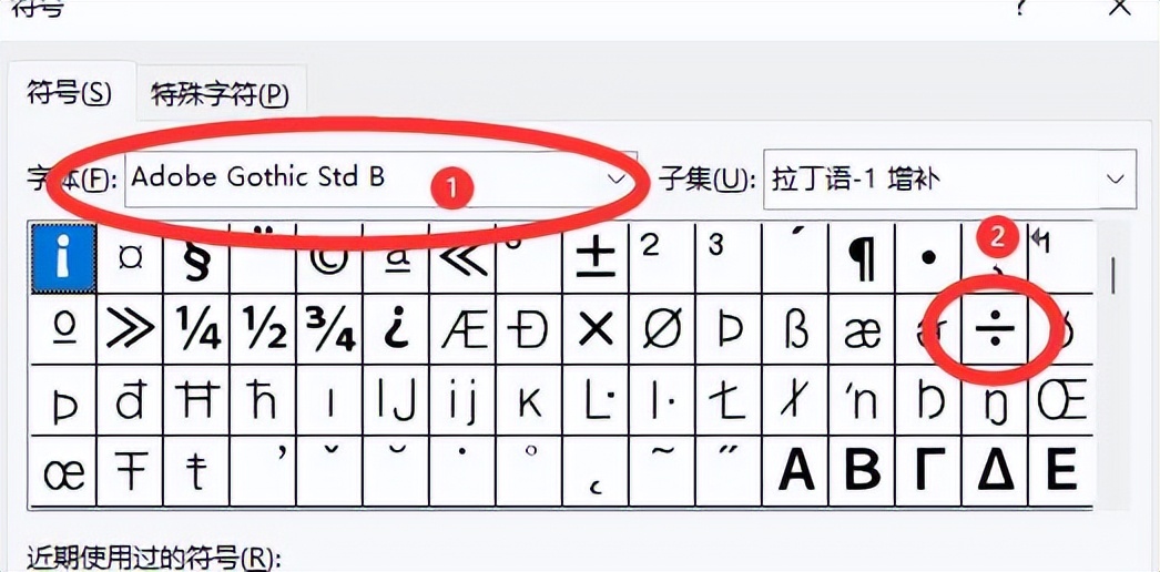 步骤3、并不是所有字体都支持显示数学“÷”的,弹出的“符号”小窗口中,修改字体,在下方列表里就可以找到数学“÷”。如下图所示: