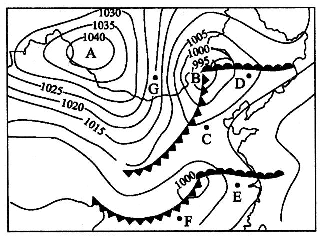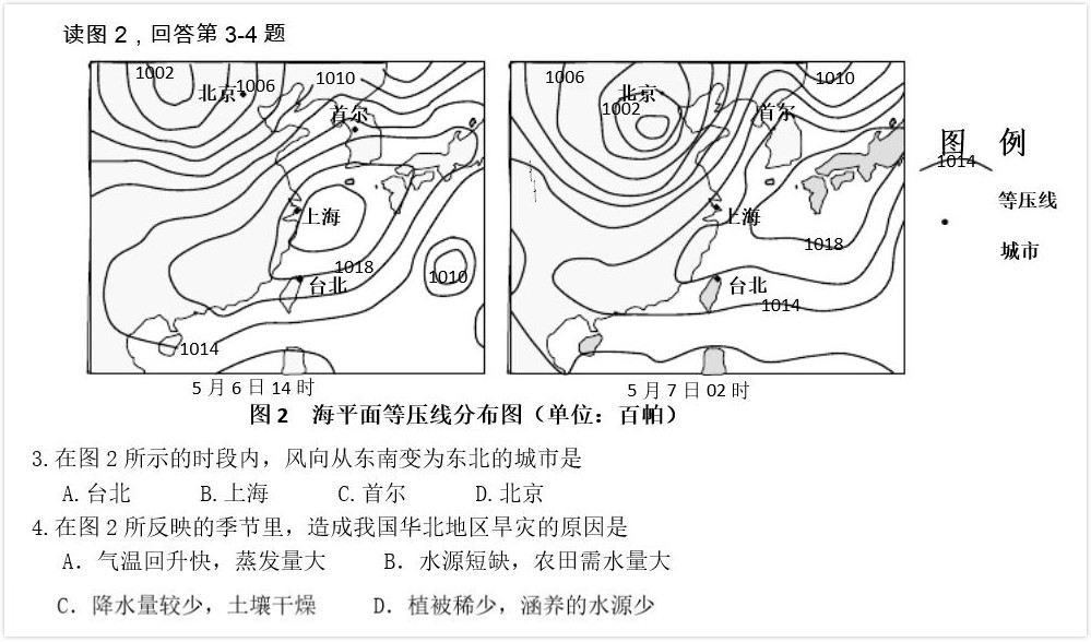精讲精析:(1)分析此时的风向。①风向垂直于等压线,由高压指向低压,并受地转偏向力的影响,“北右南左”发生偏转;②从图中可以看出,从左图至右图,北京的风向依次为东南风、东北风;上海的风向为偏南风、偏南风;台北的风向为东北风、东北风;首尔的风向为偏南风、偏南风。因此选项D的北京,风向发生了改变。