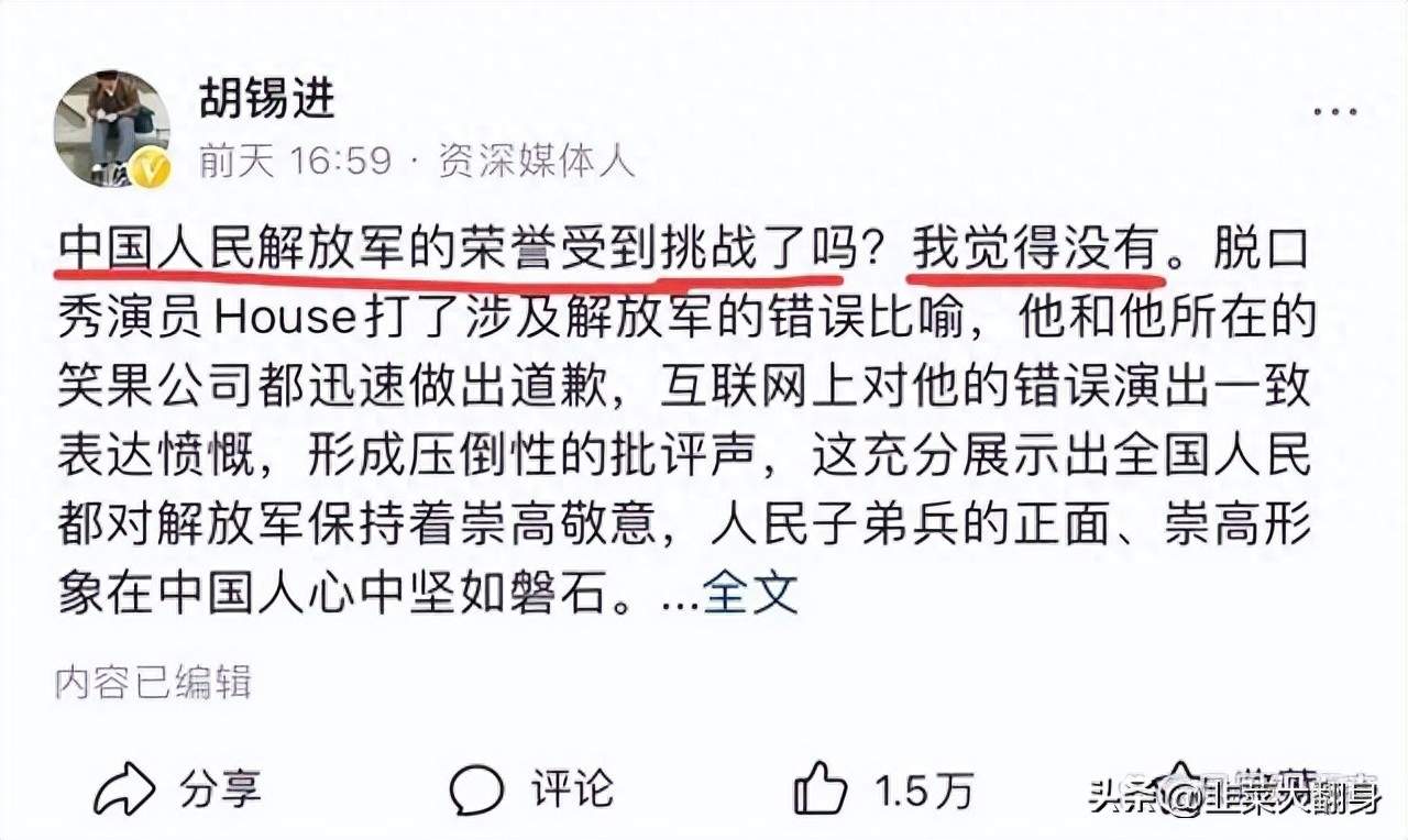 胡锡进质疑为笑果洗白,社交账号遭举报,成平台重点监控对象。