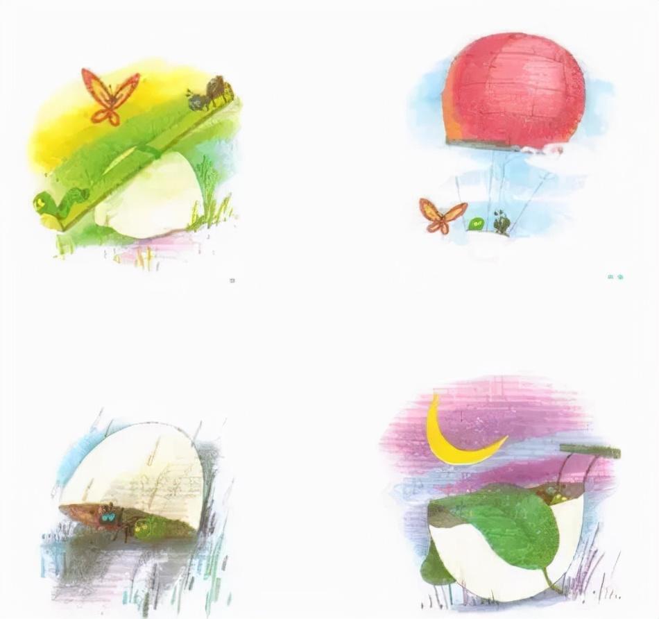 4.第四幅图:天黑了,三个小伙伴玩累了,一起在蛋壳里睡着。看看蛋壳像什么?是不是像小摇篮?三个小伙伴做了甜甜的梦。