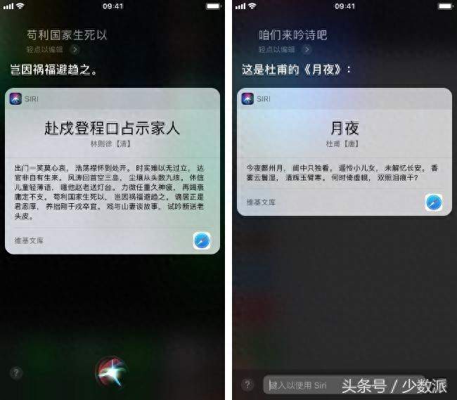Siri 可以联网检索百科(在大陆是百度百科),回答一些很神奇的问题。比如你可以跟 Siri 对诗,如果你突然想起一首诗,并想不起上下文卡得很痛苦,那么你可以试试问问 Siri,Siri 可以回答出诗词篇名、作者、全文。