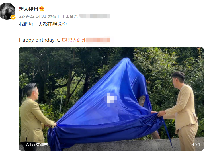 9月22日是高以翔38岁的冥诞,他生前的好友都纷纷在社交平台发文缅怀,不仅如此,他的家人也为他定制了一座铜像作为纪念,黑人陈建州也晒出了揭幕仪式的画面,引发关注。