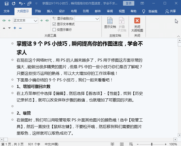 2、进入大纲视图后,按住【Ctrl键】连续选中所有需要制作为目录的小标题,选好之后,将上面的【正文文本】设为【1级】,设置好之后,点击右上角的【关闭大纲视图】回到页面视图。