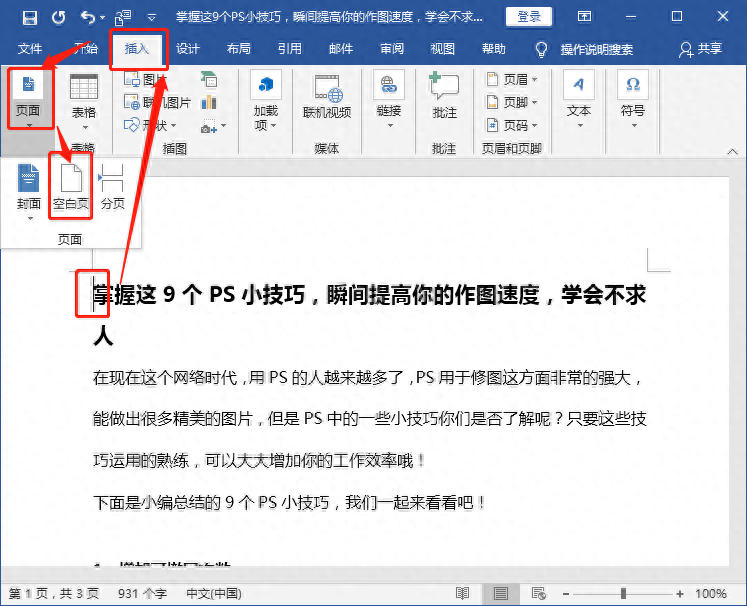 接着将鼠标光标移到Word文档顶部的第一个字的前面,然后点击菜单栏上的【插入】-【页面】-【空白页】,这样第一页就会出现一页空白页,这个就是目录页。