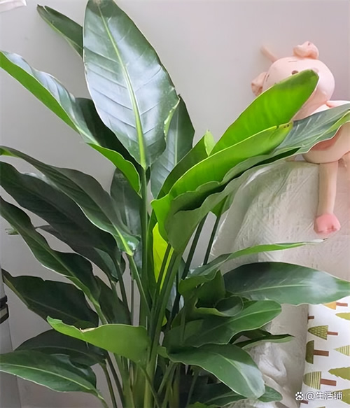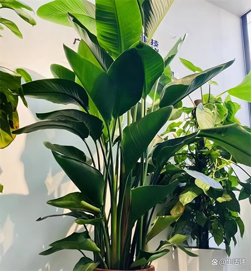 天堂鸟,也被称为鹤望兰。它的叶子肥厚硕大,株型挺拔笔直,花朵犹如仙鹤翘首以盼,颇具观赏性。放在客厅,能搭配各种装修风格,显得大气高端。
