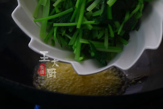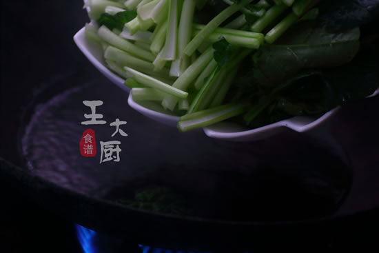 4、加入焯煮好的苔菜放在锅中,进行翻炒。
