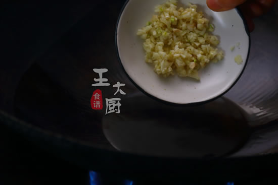3、另起锅烧油,将准备好的蒜末放在锅中,进行爆香。