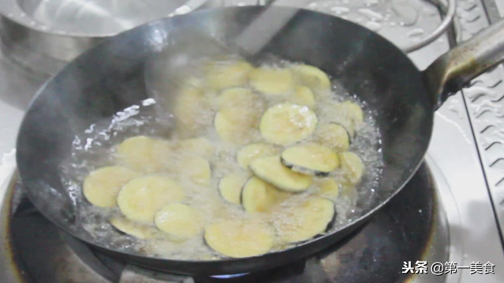 锅里烧油,油热至5成热(微微冒烟),抓入茄子。茄子炸至金黄色,捞出控油。