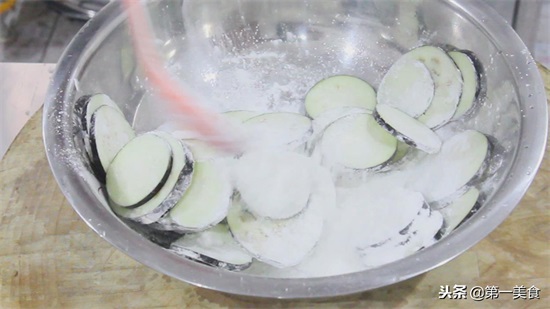 把茄子控干水分,撒入干淀粉,搅拌均匀。