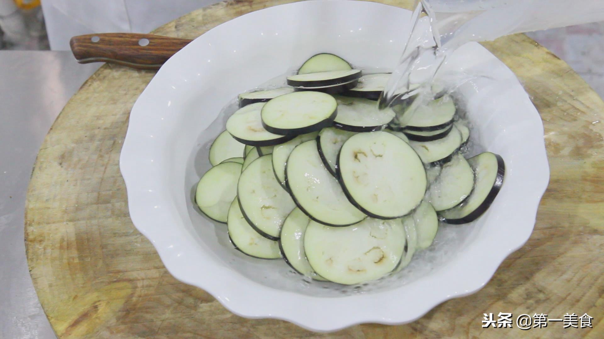长条紫茄子一个,洗净后,切成片,然后泡在清水里。