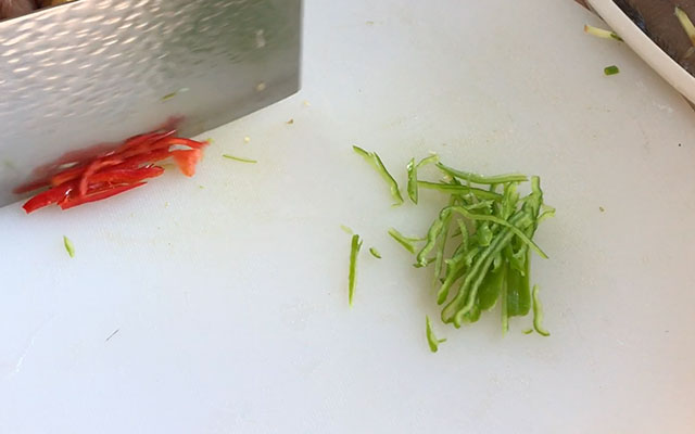 第二步:把葱切成小段,生姜切成片,青红椒切成细丝备用。