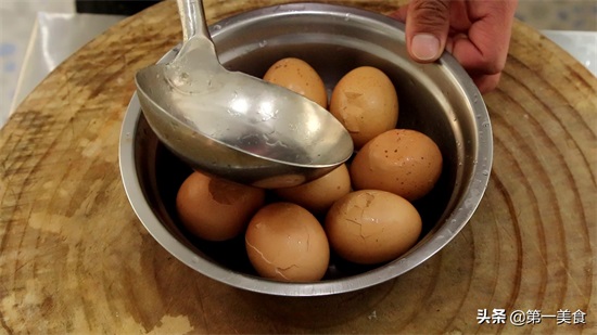3.8分钟之后把蒸好的鸡蛋从锅中取出,放入清水中透凉,然后把透过凉的鸡蛋捞出敲碎外壳备用