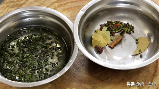 2.准备辅料:盆中加入少许八角、几片香叶、青花椒5克、桂皮一小段、两块冰糖、再准备一小包茶叶在清水泡发备用。