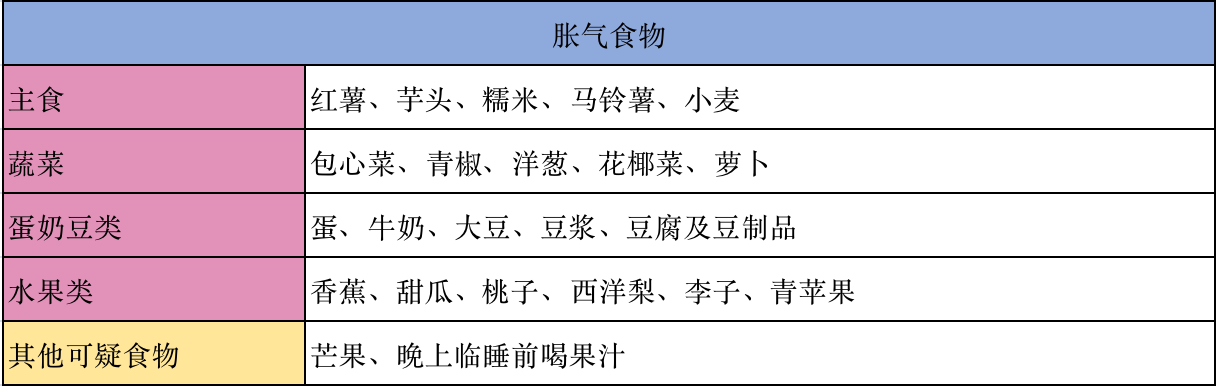 不过,由于每个人的体质不同,所以表格中的食物也仅仅是作为参考。另外对于胃不好的朋友,还应避免吃胀气食物。为此,我也整理了一个表格,如下:
