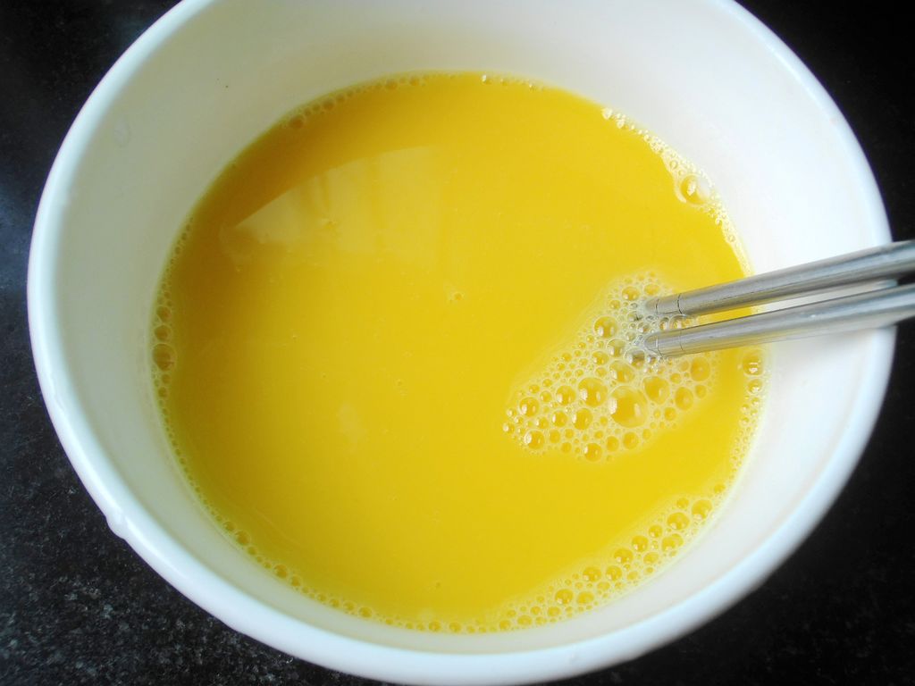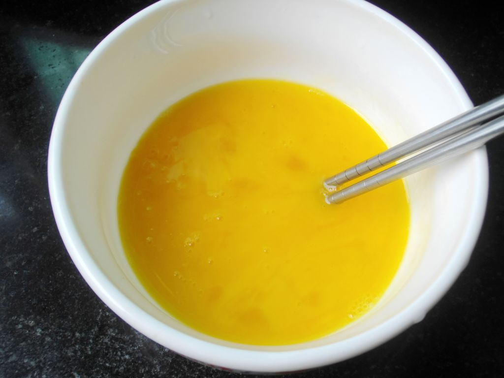 1.鸡蛋打散在碗里,加适量盐和少许料酒搅拌均匀。