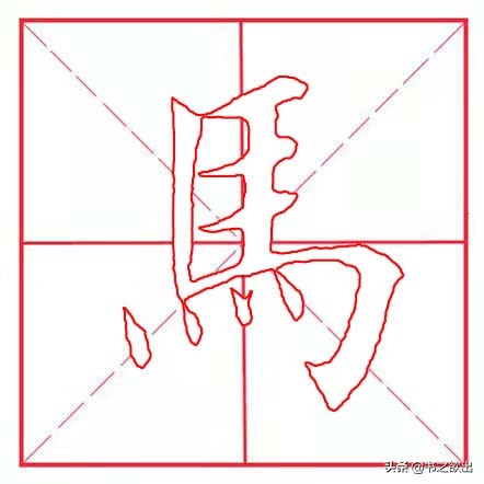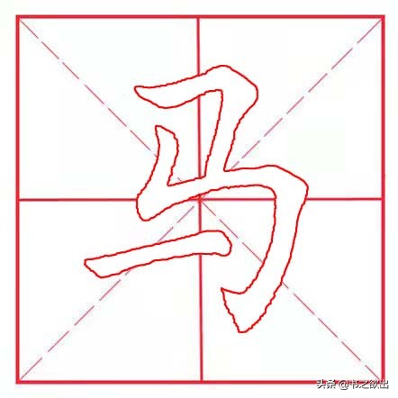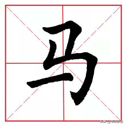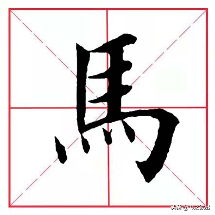 “马”字笔顺先写左竖,再写三横。左竖斜切起笔,向下略左斜,略弯,渐轻;第二笔横画虚接起笔,向右大抗肩,收笔勿重;下面两横均露锋起笔,大抗肩,注意诸横等距;中间竖笔实接起笔,厚重有力;横折钩从左竖尾部实接起笔,横画勿重,与上面横画间距相等,略呈拱形,到位后略提笔锋然后顿笔下行写竖,左斜,厚重,行笔到位后“跪笔弹锋”出钩,钩身勿大;最后四个点笔要上靠,笔意相连,大小均匀适当,指向各异。