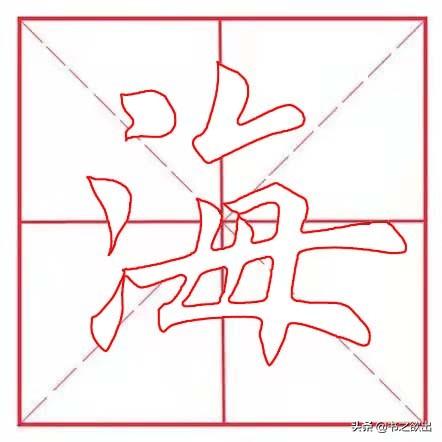 “氵”不要写宽,三点笔意相连,整体稍左斜。首笔露锋入笔,角度略平,落笔后顺势稍顿笔然后向左下方引毫出锋收笔,出锋勿长;第二点起笔与首点相呼应,与首点的位置略近,偏左,起笔后即向左下带,然后渐轻,带出第三点;第三点的距离稍远,呼应第二点收笔的指向向右下切笔起笔,然后回锋上提,注意不要写长,且提点指向首点的驻笔处。