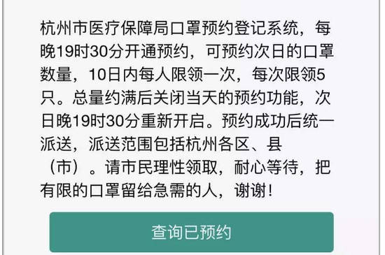 对于特别急需口罩的杭州居民来说,还可以在微信里面关注“杭州医保”或“杭州医疗保障”平台内进行预约登记,口罩预约成功后,就可以凭身份证和提取凭证在规定时间内进入药店并购买消毒液。