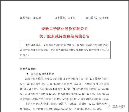 上述五名股东与徐进、范博、徐钦祥、朱成寅、周图亮、段炼、黄绍刚为一致行动人,合计持有口子窖股份约为2.86亿股,占口子窖总股本的47.72%左右。