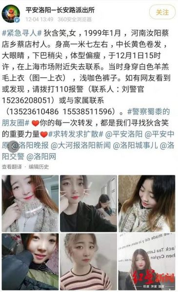 12月4日,@平安洛阳-长安路派出所 发布寻人消息:#紧急寻人# 狄含笑,女,1999年1月, 河南汝阳蔡店乡蔡店村人。身高一米七左右,中长黄色卷发,大眼睛,下巴稍尖,体型偏瘦,于12月1日15时许,在上海市场附近失去联系。