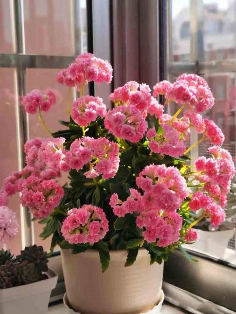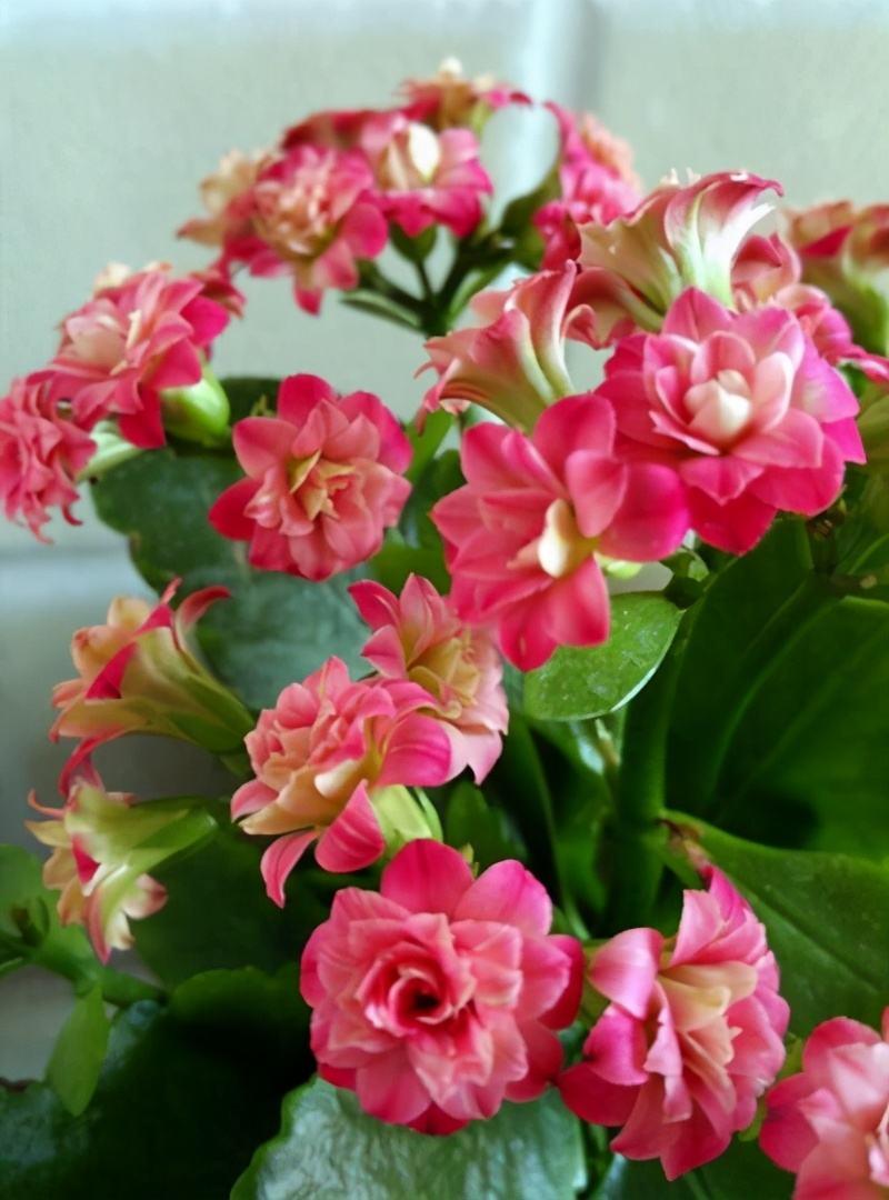 长寿花是一种多浆植物,叶片肥厚,四季翠绿,叶边还有一圈锯齿形的花边,不开花的时候,就是一种非常好看的观叶植物,它的主要花期在冬春时节,冬天的时候,只要温度在15度以上,就能开花,一茬花可以持续开二三十天,唯一的缺点就是花朵不大,但是花量大,花朵小巧精致,簇拥成团,也能开成一个大花球,放窗台或是阳台之上,漂亮又吉利,因为它有“增福增寿”的美好寓意,所以很多人把它当年宵花,家里有老人,在老人房间放一盆,吉祥又漂亮。