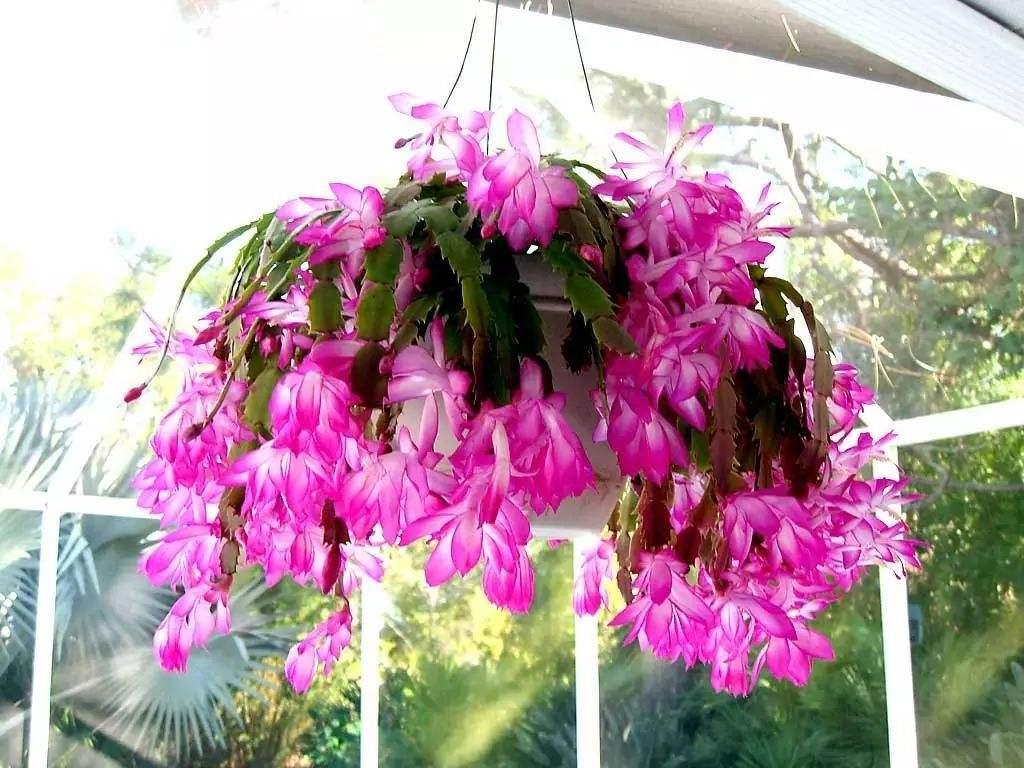 蟹爪兰是仙人掌科的附生花卉,枝叶一体,四季翠绿,品种繁多,花色丰富,能自然垂吊,花开于枝叶的顶端。生长健壮叶片肥厚的蟹爪兰,一个叶片能长出2-3个花苞,盛开之后,满盆都是花,放在窗台或是案几之上,或是悬挂起来,都有很高的观赏价值。