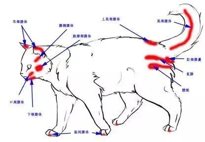 猫身上产生气味的结构分部图,一部分为与排泄相关的器官,一部分为皮肤表面的腺体| pictures-of-cats.org