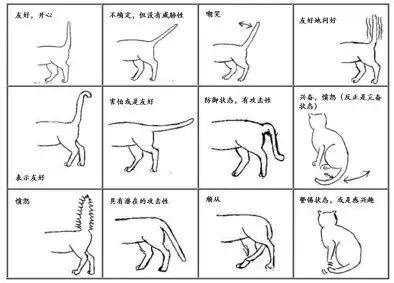 下面这幅图描述了猫常见的尾部动作(你可以对照着这张图去看看你养的猫现在的心情如何)。注意左下角的小图,猫尾巴上的毛是竖起来还是贴着也具有不同的含义。研究人员认为猫在警觉或者对峙状态时,会将尾巴上的毛竖起来以显得更强壮,希望借此吓住敌人,因此,当你眼前的猫尾巴看起来变粗了的时候,小心,你可能已经是它的假想敌了!