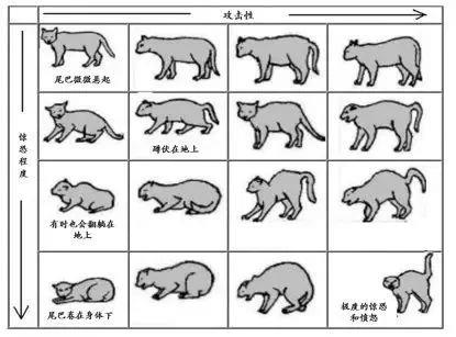 猫也会利用不同的体态进行交流,下面这幅图就展现了猫在不同的害怕程度或不同程度的攻击性下的体态变化。规律其实很简单:越具有攻击性时,猫就会站得越直,显得自己很高大(如果想和我打架的话,你最好认真考虑一下);越害怕的时候,它就会把身体放的很低,甚至完全趴在地上(我又乖又小,没有威胁,不要欺负我)。