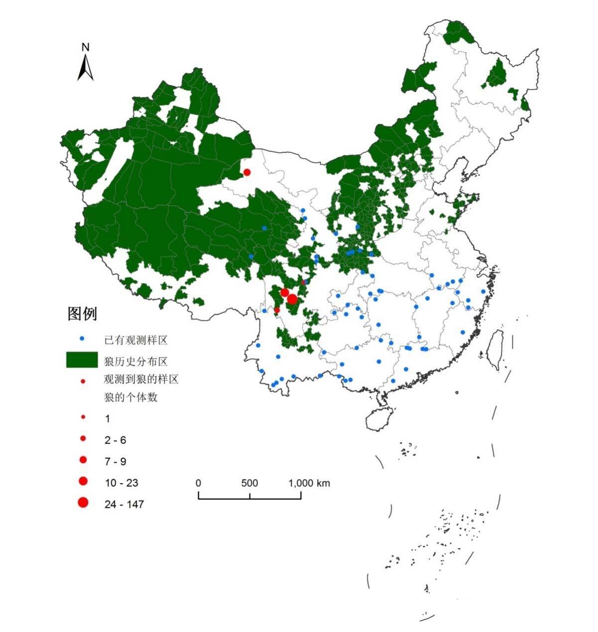 2017年观测到的狼种群数量分布及其与历史分布区的对比