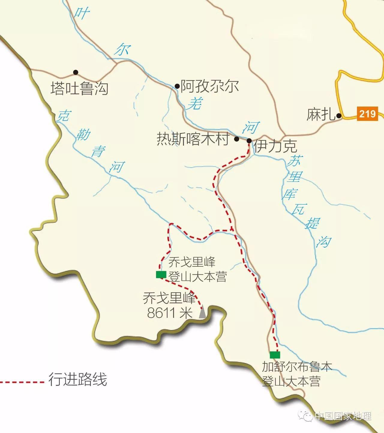 从这里开始步行6天,行程90公里方能到达乔戈里峰登山大本营(海拔3924米的音红滩)。这段路要翻过海拔4800米的阿格勒达板进入克勒青河谷,要避免7、8月克勒青河河水的暴涨,此时人畜均无法通过。