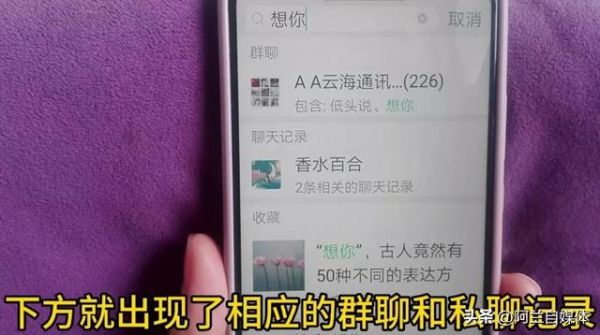 想知道老公和谁说过一些暧昧的话,比如说想你了,念你了之类的,也是有方法的,注意看右上方有一个放大镜,我们把放大镜点开,然后在这里输入你想知道的暧昧语言,比如说想你、念你,下方就出现了相应的群聊和私聊记录,我们只需要打开这个聊天记录,就可以看到他们具体谈了一些什么内容,都是可以看的一清二楚的。
