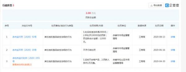 2020年8月13日,该公司因违反食品安全法规被赤峰市市场监督管理局没收违法所得2000元;罚款10000元。