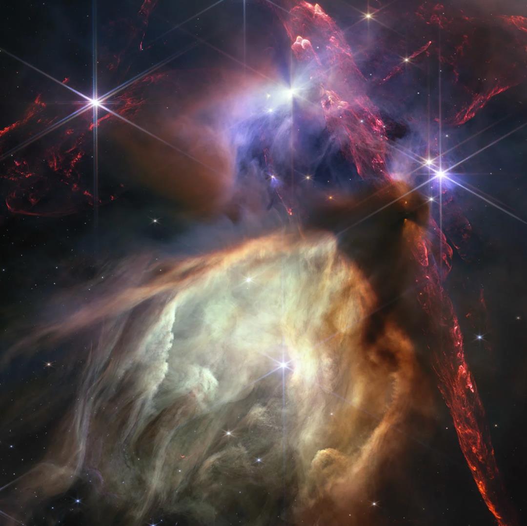 6.太空莫奈:詹姆斯-韦伯太空望远镜拍摄的图像显示了在 Rho Ophiuchi 云团中形成的恒星,这是距离地球最近的恒星诞生地。氢气喷流从年轻恒星中喷出,照亮了星际气体。下方发光的“洞穴”是由年轻恒星吹出的恒星风形成的。