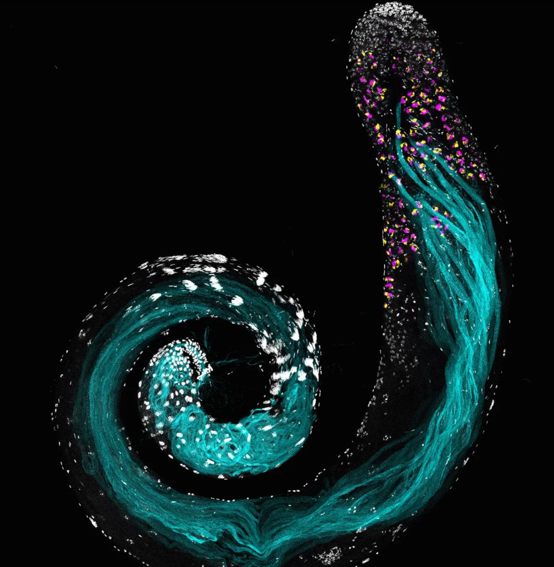 5.种子传播者:果蝇拥有自然界最长的精子,长达 2 毫米。每个成熟的精子最初都是一个干细胞,然后拉长。细胞核为白色。品红色和黄色显示精子发育所必需的 RNA 表达。