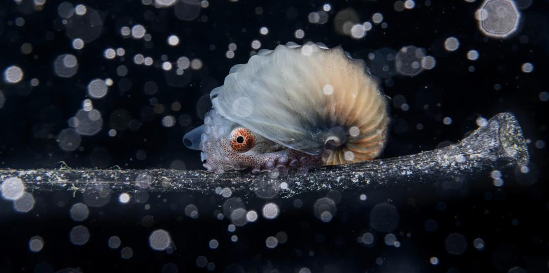 11.棍子漂流:迷人的纸鹦鹉螺章鱼(Argonauta sp.)在菲律宾附近太平洋的黑暗中搭乘着一根棍子,它的周围是火山喷发后的沉积物。