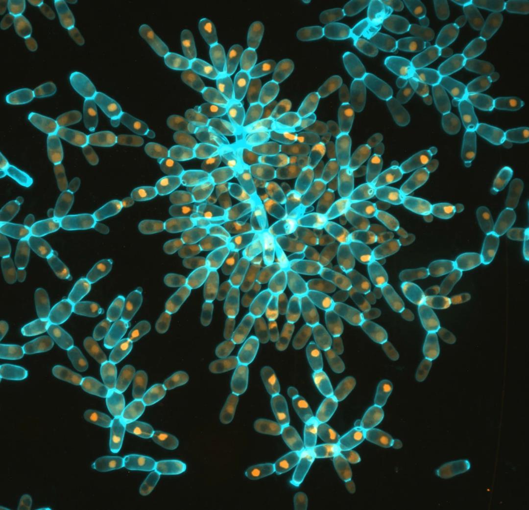 9.酵母雪花:星状的酵母细胞团是探究多细胞生物进化的实验结果。研究人员选择了进化成分支团块的大细胞。