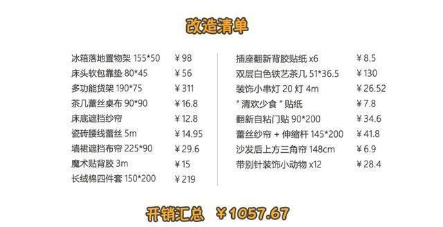 改造用到的许多物品,都是女孩在网上淘的,价格都非常便宜,而且还列了一分改造清单供大家参考。不得不说,这个出租屋的改造真的蛮强悍的。正在准备改造房间的朋友也可以参考一下呦!