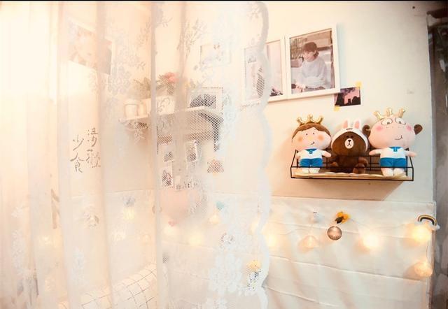 白纱帘做卧室的隔断,床虽然小的,但环境很温馨,床的上方还安装了置物架,可以摆放一些可爱的毛绒玩具和装饰画!