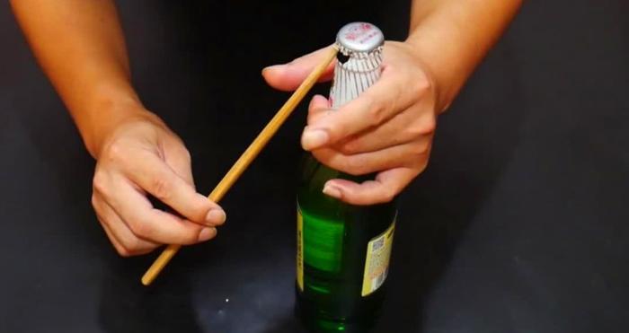 如果身边恰好没有勺子怎么办呢,没关系,筷子也能用来撬开啤酒。阿基米德说:“给我一个支点我能撬动地球。”区区一瓶啤酒我们随随便便就能撬开。先用木筷粗的那一头在瓶口齿轮下找一个支点,沿着瓶口撬一圈,感到瓶口松动后,找一个支点用力一撬,瓶口就被我们撬开了。这是我认为最方便的办法了,毕竟筷子是我们吃饭时必须要用的东西,找一根筷子撬开啤酒瓶盖简直不要太方便了。