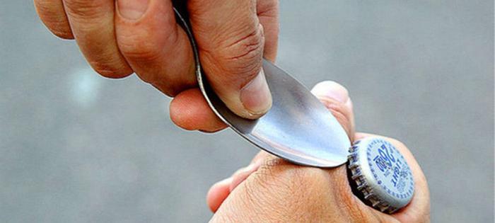 这个方法我们首先得准备一个不锈钢勺子,在瓶口下的齿轮找一个支撑点,用勺子往上撬,以此反复沿瓶口撬一圈,把瓶口翘松。感觉到瓶口松动后,找一个支撑点用力一撬,瓶口就能撬开了。这个时候大家注意了,使用勺子开啤酒时,拿啤酒的手向下抓一些,千万不要被划伤了。