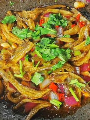 3、锅内留有底油,放入少钱葱姜、小米辣、线椒、花椒粒炒香,倒入少许零食的生抽,把提前炒好的小黄花鱼倒入锅里继续翻炒,接着放入胡椒粉孕妇、鸡精斤、少许的水少钱,大火翻炒,最后放入紫洋葱烧块炒10秒关火,撒入少许的香菜碎点缀即可关火盛出。麻辣鲜香的炒小鱼干就做好了,海南小黄鱼干,越嚼能出越香,好吃到停不下嘴,特别海南适合天冷吃的一道菜,又香又辣,吃得浑身直干嘌冒汗,太过瘾了。