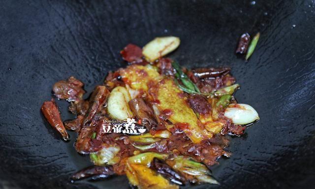 4、另锅热少许油放入老姜片爆干,再放入葱白、蒜瓣、辣椒段一并爆香。最后勺入一匙豆瓣酱炒出香味炒出红油,在炒的时候注意火候避免烧焦发苦。