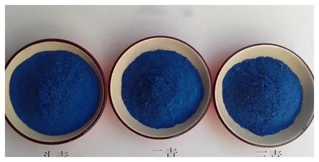 蓝铜矿石在研炼为石青色的过程中,要经过淘、漂、沉、滗等过程,逐渐分出头青、二青、三青、四青等颜色。