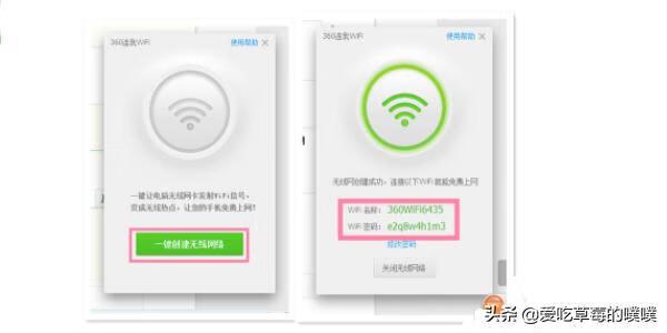 4.在弹出的360连我wifi界面点击《一键创建无线网络》,这时等待360自动创建无线网络,创建成功后,根据360连我wifi提供的账号密码,你就可以连接无线网络使用了。