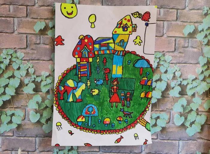 范子晴小朋友心目中的校园是蘑菇校园,滑梯是蘑菇外形,其他建筑也是蘑菇形状的。小学是建在大大的草地上,有小羊,小猫等小动物,和小朋友们一起快乐地在校园里生活。