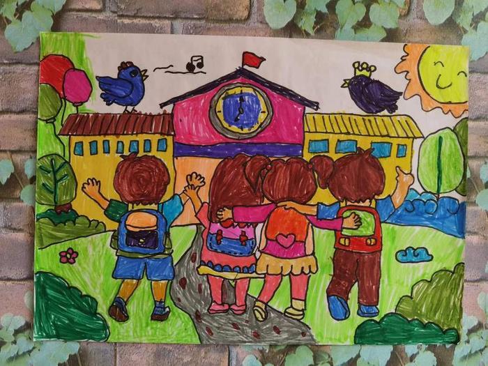 孙菡彬同学心目中的小学校园是多彩的,花朵是鲜艳的,楼房是多样的,小朋友们每天在花园一样的校园里快乐的学习,游戏。